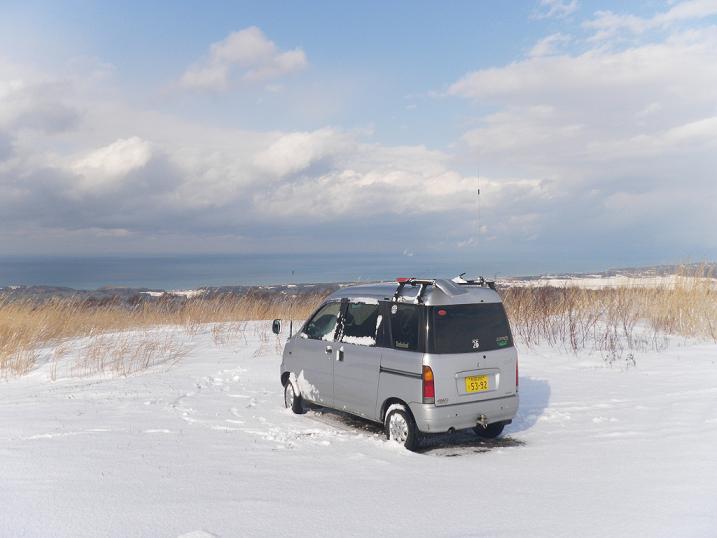 風も物凄い、車が大きく揺れてます。でも車の中は暖かく快適、こんな空間が好きです。