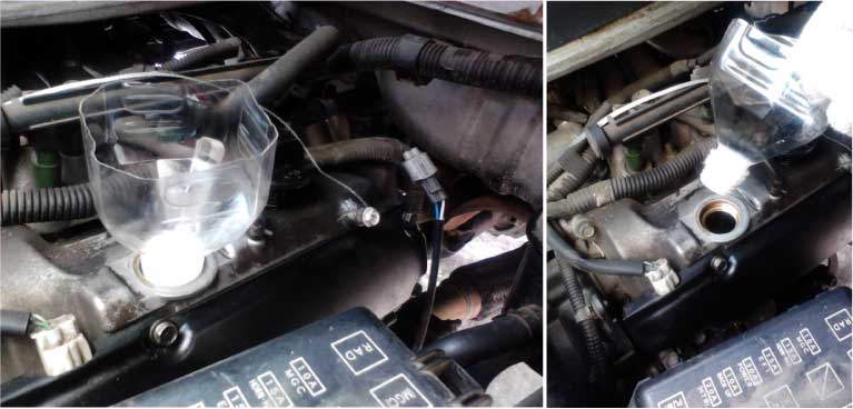 この上の部分をカットしてオイル口に差し込んだら、あら!ピッタシ!ただ合うだけでなく、ペットボトルキャップの切り込みとこれまたピッタシで、2回転ほど回しこむとグラつく事も無くなり安全にオイル補給ができました。
