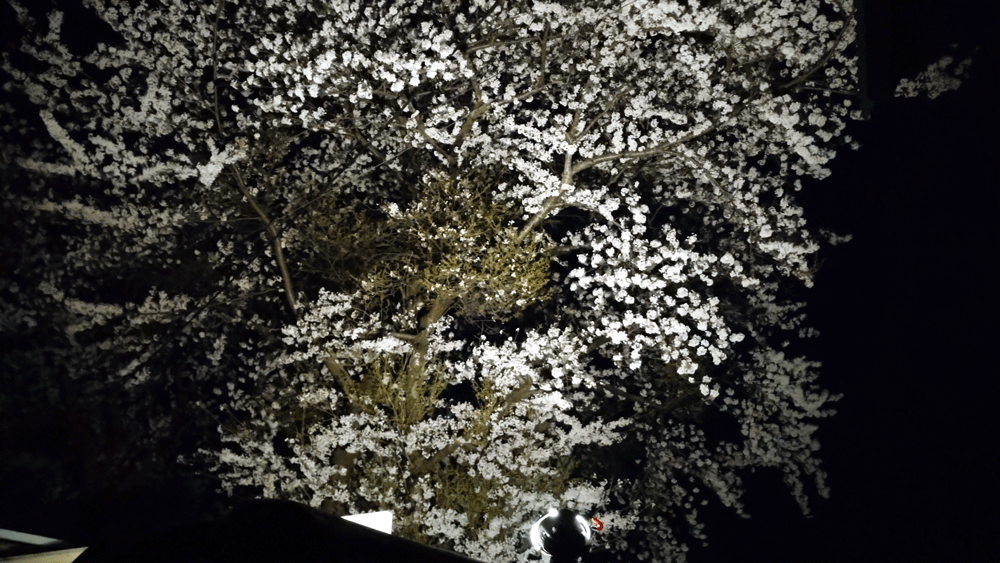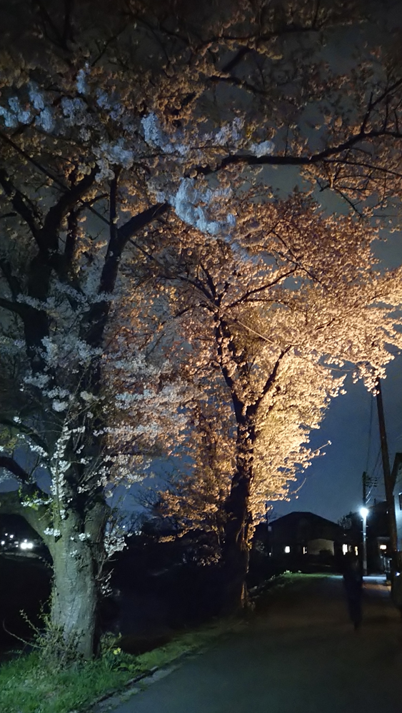満開の桜、どこの桜祭りも中止なので、家の前に生えている桜に、作業用の投光器を当ててみたら、想像以上に素晴らしい夜桜になりました。