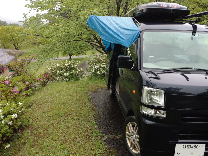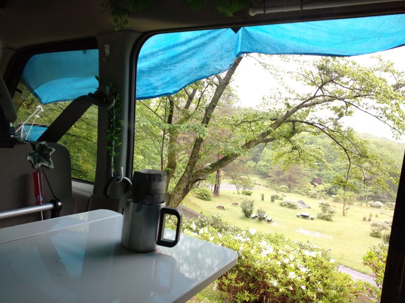 雨の日に景色を楽しみながらコーヒーを飲もうとしても、サイドドアを開けたままでは雨が車内に入り込むのでやり難かったのですが、この日ひさしを付ける事で、ドアオープンでも景色を眺めながら美味しいコーヒーを頂けます。